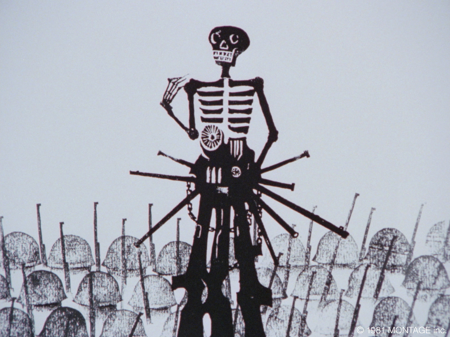 富山はこの弾圧に黙ってはいられなかった。即座に反応し、版画作品「倒れたものへの祈祷」で巡回展を実行した。富山の行動には、独裁者に対する憤り、犠牲者への鎮魂がある。その強い思いが前田監督を動かし、翌1981年に本作が製作された。映画では、リアルなニュース映像が事件の実態を伝え、影絵のように展開する富山の版画が弾圧と犠牲の本質を訴える。